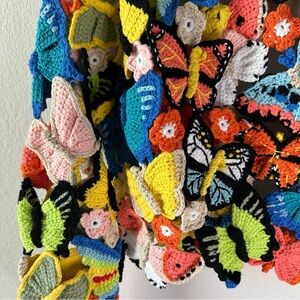 This jacket is truly a work of art featuring a mix of butterfly embellishments and patchworked crochet. It's made to be worn open over anything from basic white T-shirts to tanks. It's such a special piece that feels like it has an heirloom quality.
