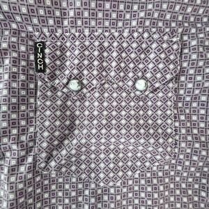Cinch Long Sleeve Button Down Shirt. Long sleeve pearl snap style with a multicolor maroon and purple pattern, suitable for western wear, casual use, or ranch wear.