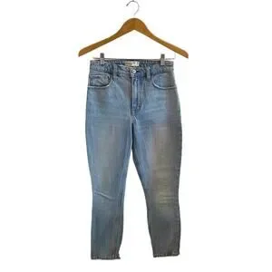 This high rise skinny jean has built in stretch with a form-fitting silhouette from top to bottom. This style is in a medium to light blue wash with whiskering and fading throughout and a raw hem at the ankle. 99% cotton, 1% elastane. Great preowned condition, no flaws.