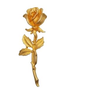 Beautiful vintage brooch is bright matte goldtone and depicts a single stem rose. Brooch measures 3-1/8 inches long and 1 inch wide. Excellent condition