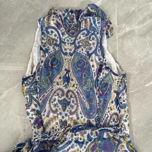 Good condition - Women’s Lauren Ralph Lauren Paisley Floral Ruffle Tie Up Wrap Silk Dress. Has wrap design with tie belt closure, lining layer, and ruffles along the neckline. Colors: purple, blue, yellow, and white. Size: 2.