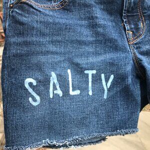 Painted and patched cutoff denim shorts, junior size 8, ocean theme. This is a cute pair of jeans that have been upcycled by turning them into cutoff jean shorts, applying handmade patches and painting the word "Salty" on the front.