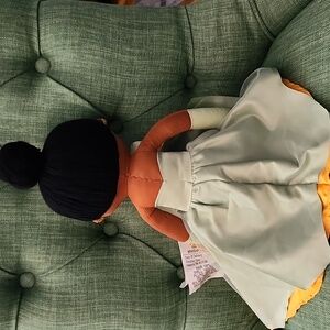 Charming Tiana plush doll featuring black hair and a classic green dress. Perfect for imaginative play and cuddling.