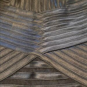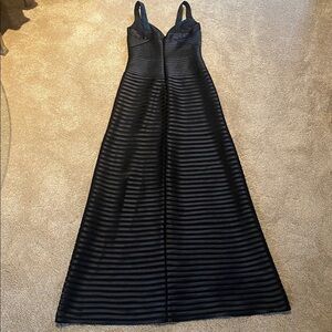 BCBGMaxazria Long Black Formal Maxi Dress Sleeveless Satin & Mesh Paneled This incredibly flattering BCBGMaxAzria black dress features a sweetheart neckline and tank style straps. The crisscross style bodice is structured, allowing for a cinched waist and that works beautifully with the A line silhouette. DETAILS Lined Mesh stripe detail Sweetheart neckline Back zip closure Lined bustier inner top with boning. Skirt has a built in black liner. Shell: 100% polyester Lining: polyester, nylon, spandex