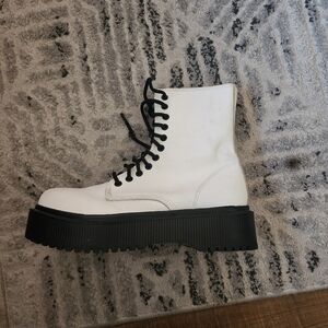 Keywords: Jeffrey Campbell combat boots, white platform boots, chunky lace up boots, grunge festival boots, Y2K platform shoes, goth punk boots, Jeffrey Campbell chunky boots, edgy streetwear boots, festival combat boots