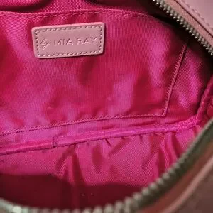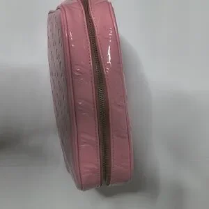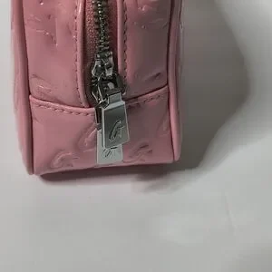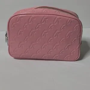Stylish pink cosmetic bag with embossed logo design. Perfect for travel or daily use.