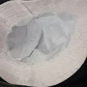 Stylish white bucket hat featuring a red and green stripe. Perfect for casual outings.