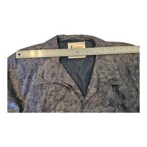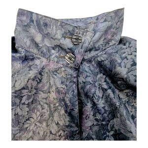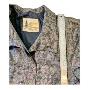 Vintage London Fog trench coat for women in size 10P. Features floral details and button-down closure. Shoulder pads create a structured, classic look.