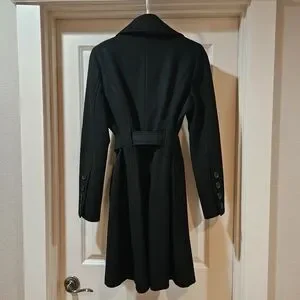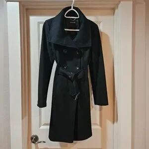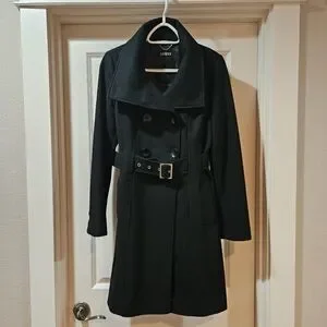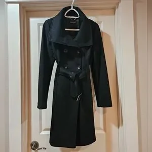 Guess Double Breast Wool Blend Coat Heavyweight Funnel Neck Belt Siz 6 Black EUC