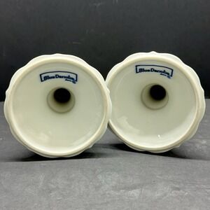 These Blue Danube Onion Candlestick holders are a set of two decorative pieces made of porcelain, featuring a blue and white floral design in a glossy finish. With a height of 6 1/4 inches and a rectangular backstamp indicating their origin from Japan, these candle holders are suitable for taper/dinner candles. The vintage, original design adds a touch of elegance to any room, making them a stylish addition to your home decor.