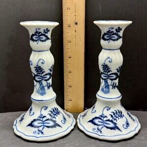 Blue Danube Onion Candlesticks Rectangle Back Stamp 6 1/4" Tall Japan EUC