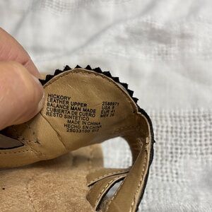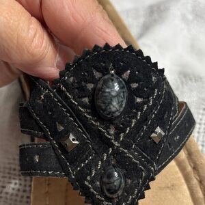 Elegant Earth Spirit sandals with intricate black straps. Comfortable beige footbed. Perfect for everyday wear.