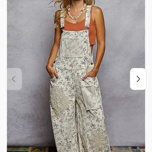 Chic floral jumpsuit by POL. Features patchwork design. Cream base with blue floral accents. Comfortable and stylish.