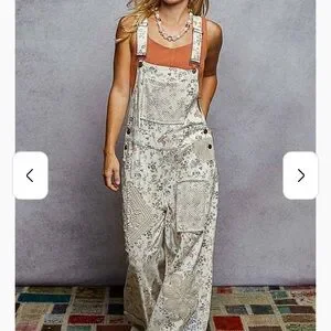 POL Floral Patchwork Overalls in Cream and Blue Lace Flare Boho Size Small!