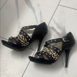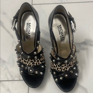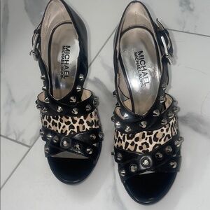 NWOT Michael Kors black stiletto heels, 4.5 inches high. Featuring sleek patent leather with animal print and eye-catching silver-toned embellishments. The open-toe design and multiple straps offer a chic and secure fit, perfect for any sophisticated occasion.