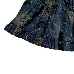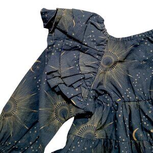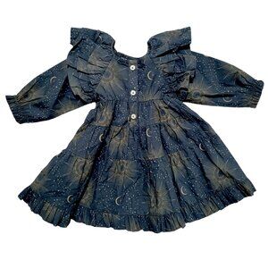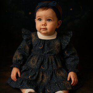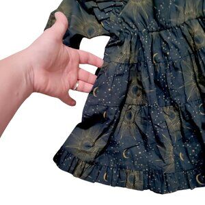 long sleeve dress, tiered dress, ruffle dress, flutter sleeve dress, midi baby dress, boho, peasant dress, vintage-inspired, cottagecore celestial moon and stars print, sunburst print, cosmic print, celestial pattern, astrology print, mystical print, constellation dress, galaxy baby dress, celestial theme, and starry night dress.