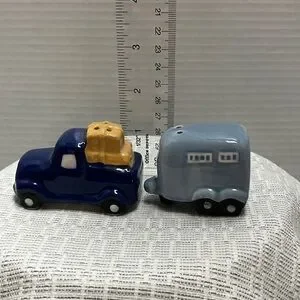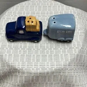 Charming blue truck and camper salt and pepper shakers. Perfect for adding a whimsical touch to your table.