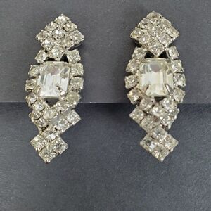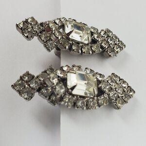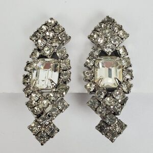 Vintage Clear Crystal Rhinestone Glass Statement Silver Tone Metal Clip On Earrings