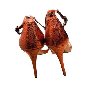 Sam Edelman Ariella ankle strap sandals in a rich auburn metallic leather finish.