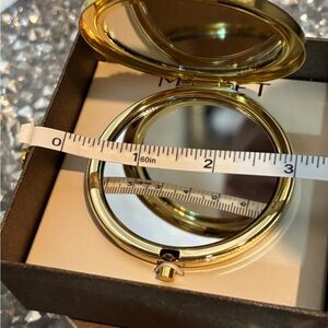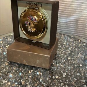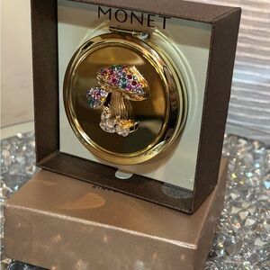 Elegant gold compact mirror featuring a mushroom design adorned with colorful gemstones. Perfect for adding a touch of whimsy to any outfit. New in box. Beautiful and fun.