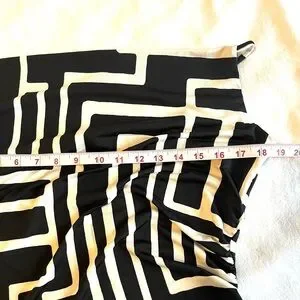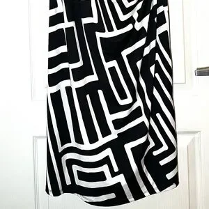Jules & Leopold midi dress. Features black and white geometric print, cowl neckline, and adjustable spaghetti straps. Perfect for a party or a stylish day out.