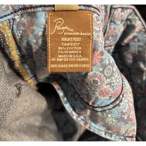 Design details: Classic five-pocket styling with double-button waistband and zip fly closure, belt loops, Paige logo rivets and buttons, back patch pockets with stitched detail, small Paige logo patch at back waist, and floral print inner waistband lining.
