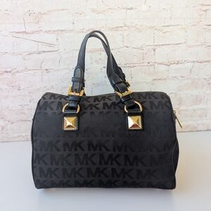Michael Kors Grayson satchel in black signature monogram canvas with gold-tone hardware. This style is a popular, classic barrel-shaped bag that features top handles, a zip closure, and the signature round "MK" logo bag charm.