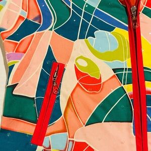 The Redd Jeans Sequin Zip Up Blazer is a funky and stylish statement jacket designed for women in size 10. Made from a cotton blend with a polyester lining, this short jacket features a geometric pattern with colorful sequin accents and contrasting red trim. It has a zipper closure and zipper pockets. The abstract and geometric artful pattern is multicolor featuring hues of greens blues and peach. The jacket is machine washable and has a regular fit, perfect for the summer, fall, and spring seasons. The Redd Jeans brand ensures quality and a basic jacket style that is sure to make a statement. Extra sequins included!