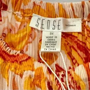 Flowy top with vibrant paisley pattern. Features orange and red hues. Perfect for casual wear.