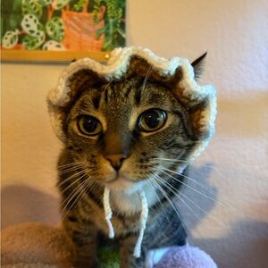 Adorable crochet pet hat in brown and white featuring a handmade bow. Perfect for keeping your furry friend cozy and stylish.