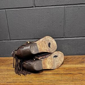 Circle G by Corral women’s western-style ankle boots in size 6. Brown leather with fringe detail at the heel, side zipper closure, and stacked heel. Classic western/boho look that works great with jeans or dresses.
