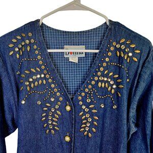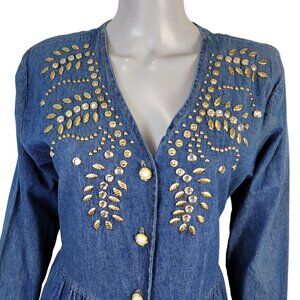Vintage 90s Denim Midi Dress Women Medium Teacher Embellished Rhinestone 8 10 M