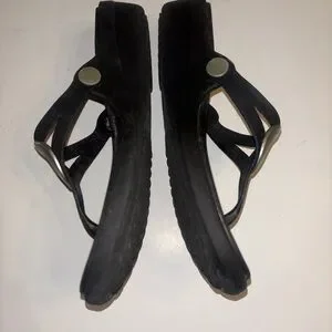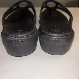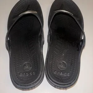 Stylish black sandals with a silver circular accent. Comfortable and versatile for any occasion. This is a pair of black Crocs Women's Sanrah Beveled Circle Wedge Flip sandals with a silver-colored O-ring. Preowned as is in a size 7. Make an offer
