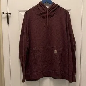 Cozy Carhartt hoodie in rich burgundy. Features a front pocket and drawstring hood. Ideal for everyday wear.