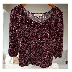 Elegant blouse with a playful pink and black design. Lightweight and perfect for versatile styling.