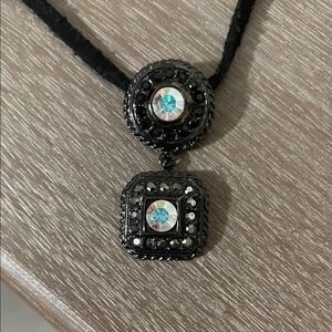Chic black necklace with ornate silver pendants. Handcrafted elegance for any occasion.