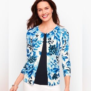 Brand new with tags - Women’s Talbots Charming Button Down Cardigan Watercolor Blossom Flowers. Has buttons down the front and an extra button. Colors: blue and white. Size: S.