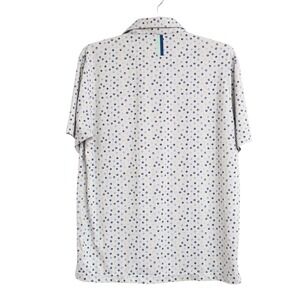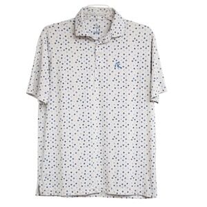 This RHOBACK Golf Polo is a Men's size Large. It is very light Gray with Blue Dog Paw Prints all over. Performance athletic material. Stretchy and moisture whisking. Great Preowned condition!