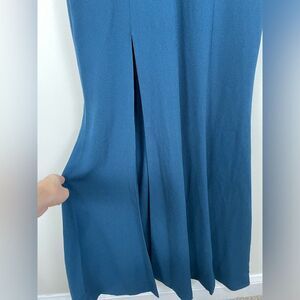 New with tags Dress the Population floor length gown in Peacock Blue. Women’s size Small. Spaghetti straps and v-neck line. Slit on the front at one leg. Slight mermaid flare at the bottom.