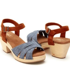 Toms blue/copper chunky wood clog sandals, sz 6. EUC; minor signs of wear are shown in photos.