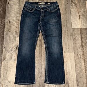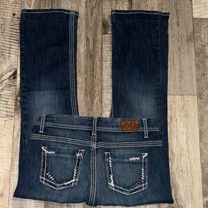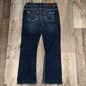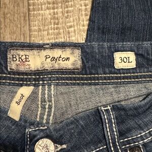 Elevate your wardrobe with these stylish blue jeans made by BKE-Peyton style-size 30. Perfect for any occasion, these jeans offer both comfort and fashion. Factory distressed fading/lightening throughout. 99% cotton 1% spandex. Waistband measurement lying flat is 17.5 inches, rise is 8.5 inches, inseam is 29 inches.