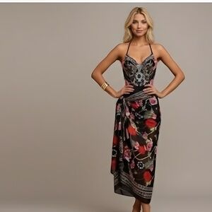Boho Floral Print Halter Tie Front One-Piece Swimsuit With Cover Up