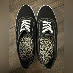 Casual, chic, and comfy — these Kelly & Katie lace-up canvas sneakers feature a classic black upper with crisp white stitching and laces, paired with a fun leopard print interior that adds a pop of personality.