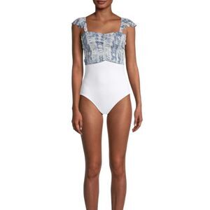 LA MODA CLOTHING Shirred Tie-Dye Cover-Up Crop Swim Top, Blue/White, L/XL, NWT