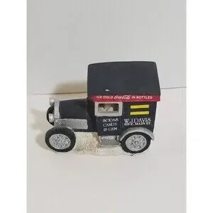 Vintage-style Coca-Cola delivery truck figurine featuring classic advertising details including Ice Cold Coca-Cola in Bottles, Soda, Candy & Gum, and storefront graphics. Designed in an early 1900s delivery truck style with hand-painted details and textured base.