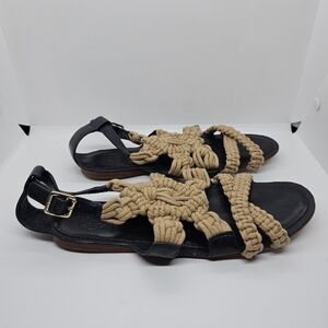 Tory Burch black leather and tan macrame Fleur flat sandals 8.5M