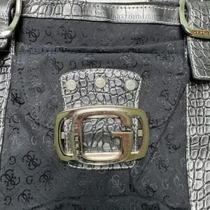 Features black Guess monogram canvas with croc-embossed faux leather trim and silver-tone hardware. Statement front G buckle logo and adjustable shoulder straps. Structured silhouette but roomy enough for everyday essentials.