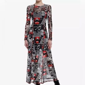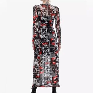 Look cool while rocking out with Emily the Strange and her kitties! This mesh, long-sleeve maxi dress features a punk-inspired collage depicting Emily, her cats, swirls, checkers and more! Comes with a slip underneath.