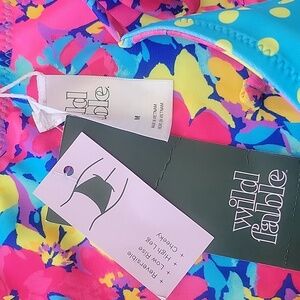 Wild Fable Reversible Slider Top Floral Bikini Set, Size Med . Low Rise, High Leg, cheeky, hidden pad area. Bright and colorful bikini set featuring a vibrant floral design on one side and polka dots on other.Perfect for fun days at the beach or pool. NWT.