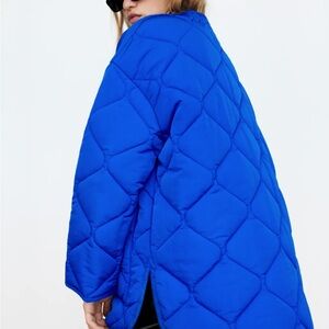 Bold blue puffer jacket by Zara. Features quilted design. Ideal for warmth and style. This would be more fall/travel density of puffer and is not a winter jacket! Can easily be dressed up or down. Size medium but very generous fit based on style. NWT.